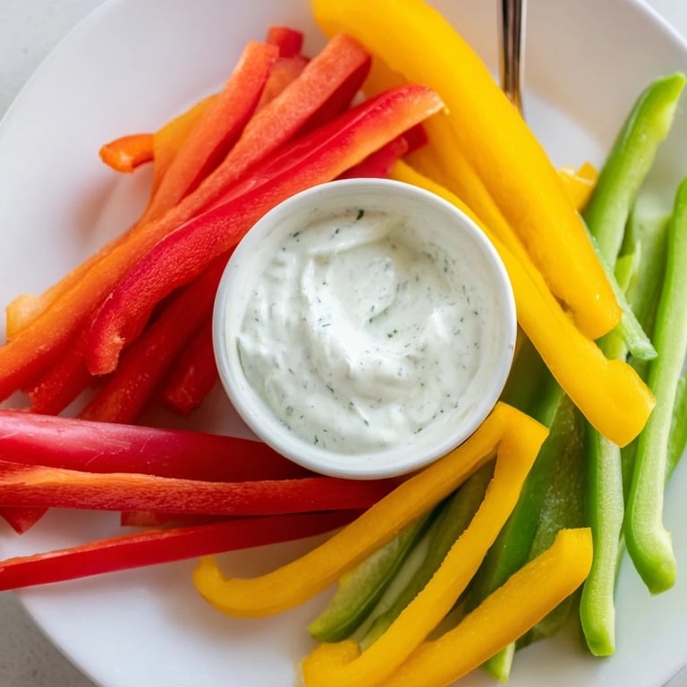 Merken Ein lebhafter, nahrhafter Snack mit knackigen Paprikastreifen, die um eine Schale mit würzigem, mit Kräutern verfeinertem griechischem Joghurt-Dip angeordnet sind – perfekt für Partys oder einen schnellen gesunden Snack.