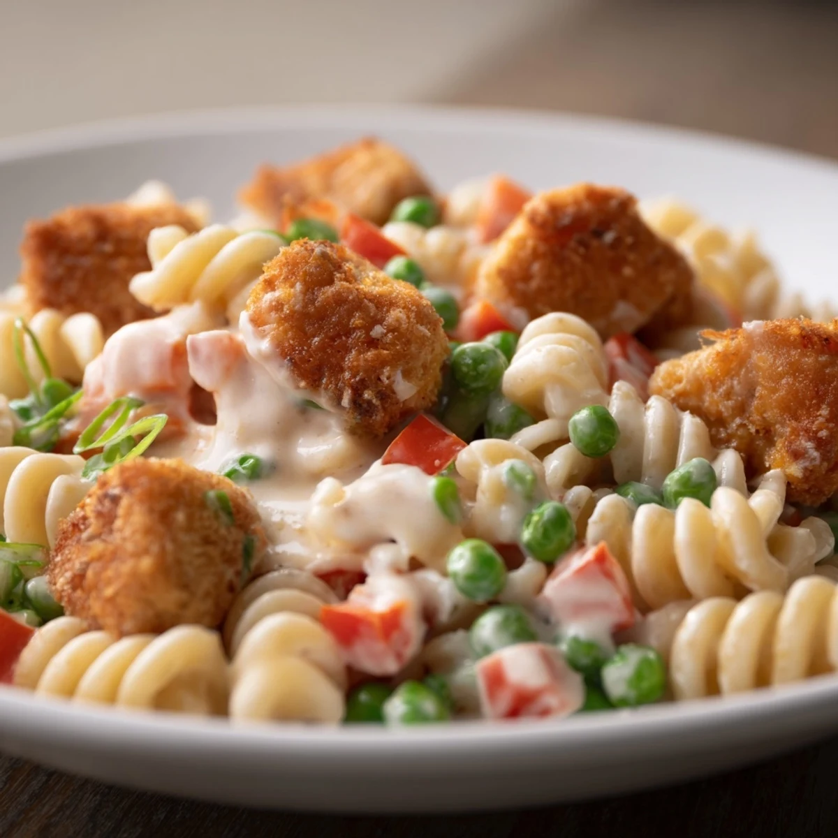 Merken The secret to this salad lies in the contrast between the warm, crispy chicken and the cool, creamy pasta. By breading the chicken in panko crumbs and frying it until golden, you create a texture that stands up beautifully to the rich dressing and sweet peas.