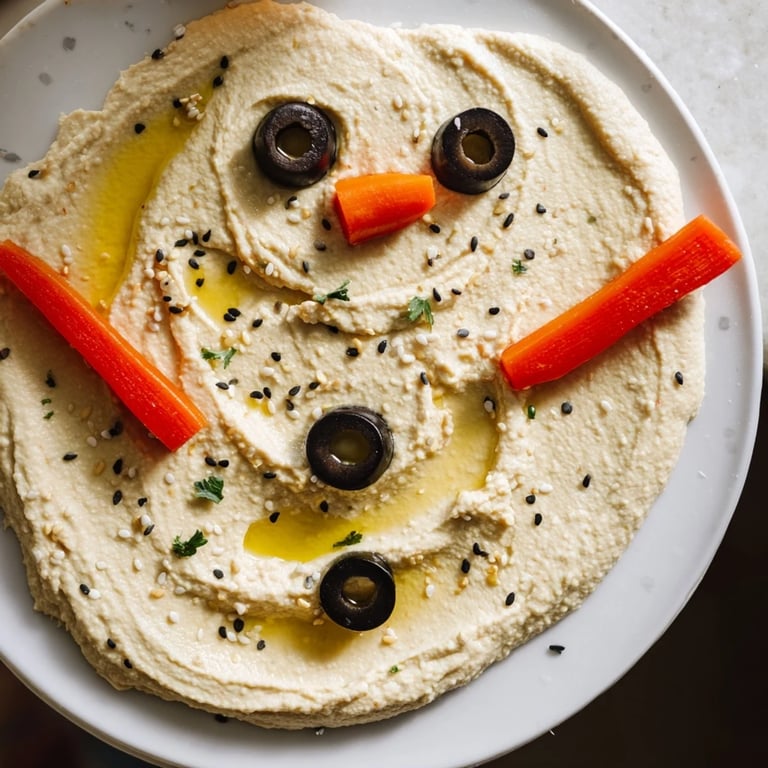 Diese farbenfrohe Hummusplatte besticht durch ein einzigartiges Schneemann-Design, das auf einem großen Teller mit klassischen Zutaten liebevoll gestaltet wird. Mit Oliven, Karotten und Paprika entstehen Augen, Nase, Knöpfe und ein Schal, die die winterliche Stimmung einfangen. Serviert mit verschiedenen Gemüsestreifen und glutenfreien Crackern, ist das Gericht schnell vorbereitet und überzeugt durch Frische und Festlichkeit. Ein perfektes Highlight für kalte Jahreszeiten.
