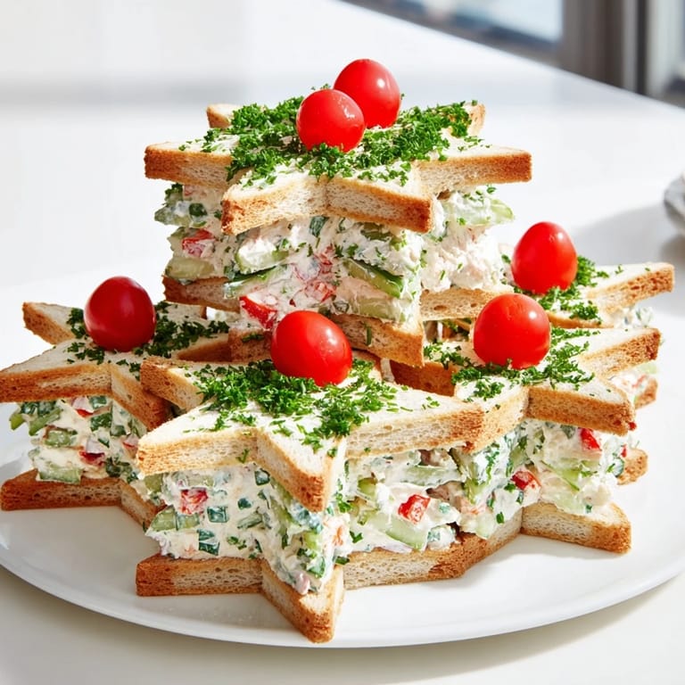 Merken Diese festlichen, mundgerechten Sandwiches sind in Sternform geschichtet, um kleine Weihnachtsbäume zu ähneln – perfekt für Feiertagsfeiern und Kinderpartys.