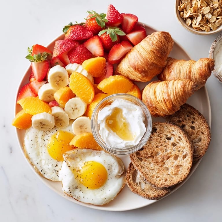 Merken Ein lebhaftes, energiespendendes Frühstückstablett mit frischem Obst, handwerklichen Broten, Eiern und einer Prise Süße – perfekt, um den Tag mit Farbe und Geschmack zu beginnen.