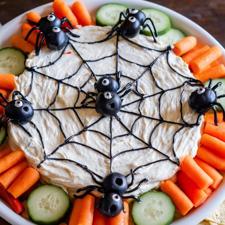 Merken Eine lustige und gruselige Vorspeisenplatte mit cremigem, netzförmigem Dip, knackigem Gemüse und essbaren Spinnen – perfekt für Halloween-Partys oder thematische Zusammenkünfte.