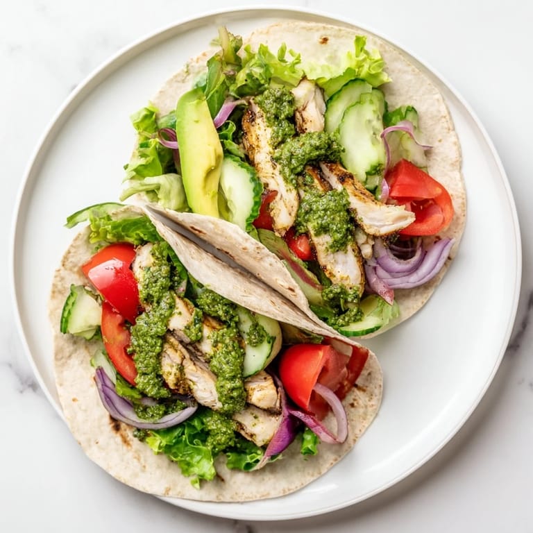 By marinating the chicken in a fresh blend of parsley, cilantro, and garlic, every bite is infused with bright, tangy notes. Combined with sliced cucumber, tomato, and red onion, this wrap delivers a satisfying crunch that complements the tender grilled chicken perfectly.