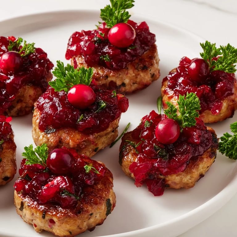 Merken Diese herzhaften Wursthäppchen mit würziger Cranberry-Soße und frischen Kräutern sind perfekt für festliche Zusammenkünfte und Cocktailpartys.