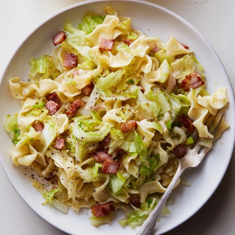 Merken Ein herzhaftes und wohltuendes bayerisch-österreichisches Gericht mit gebratenem Kohl, knusprigem Speck und zarten Nudeln, alles zusammen für eine herzhafte, zufriedenstellende Mahlzeit.