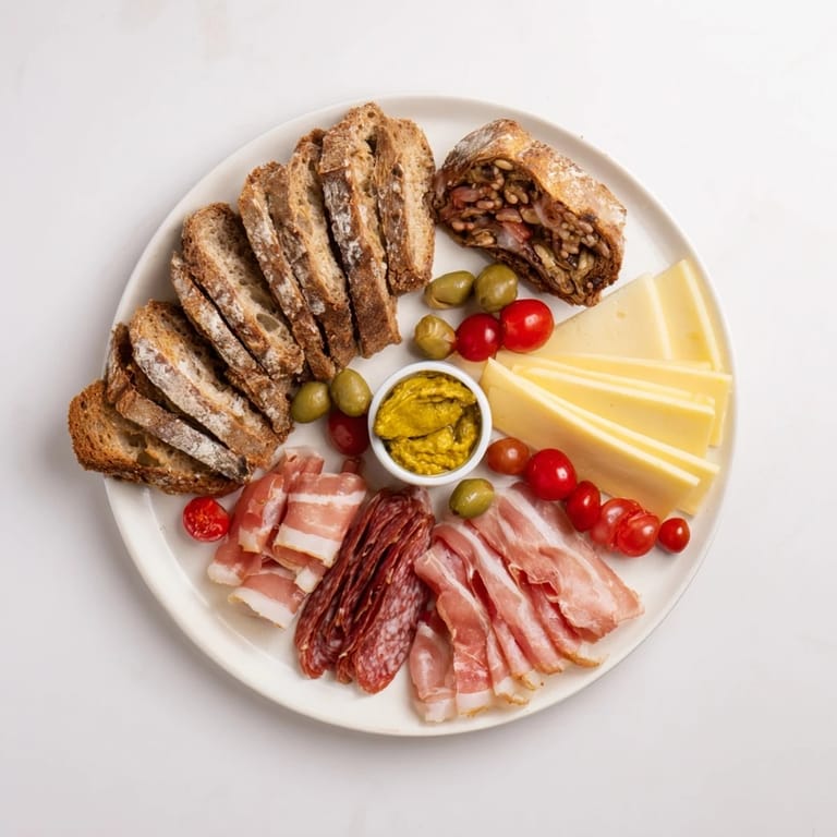 Merken Eine rustikale und herzhafte berginspirierte Snackplatte, perfekt zum Teilen nach einem Tag voller Abenteuer. Diese Platte enthält regionale Käsesorten, luftgetrockneten Aufschnitt, frisches Brot und bunte Beilagen für eine energiespendende und gesellige Jause.