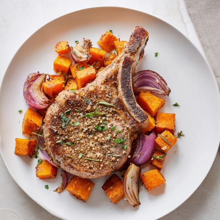 Merken Saftige Schweinekoteletts, geröstet zusammen mit einer Mischung aus saisonalem Wurzelgemüse, für eine geschmackvolle One-Pan-Mahlzeit mit minimalem Aufräumen.