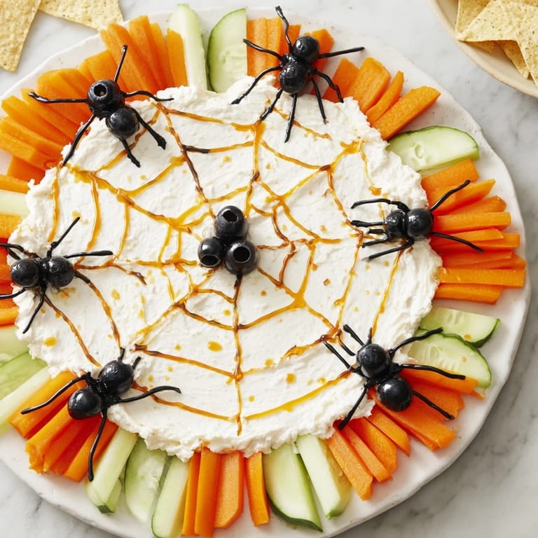 Merken Eine lustige und gruselige Vorspeisenplatte mit cremigem, netzförmigem Dip, knackigem Gemüse und essbaren Spinnen – perfekt für Halloween-Partys oder thematische Zusammenkünfte.